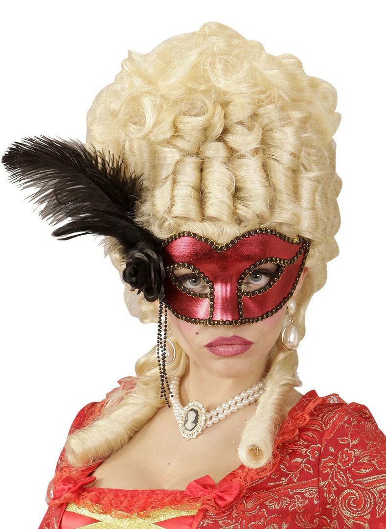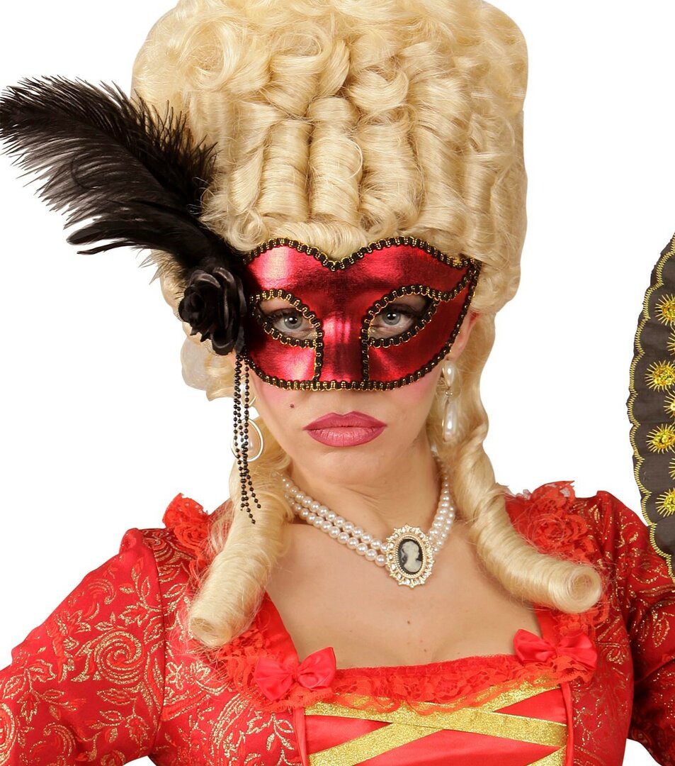 Benátska červená škraboška s čiernou ružou, perím a korálkami - Žiarivý symbol elegancie a tajomstva. Táto škraboška prináša do vášho plesového večera neodolateľný šarm Benátok. S bohatou červenou farbou, jemným čiernym ružovým kvetom, nežným perím a jemnými korálkami zaujme každý pohľad. Buďte stredobodom pozornosti a zahaľte sa do luxusu s touto jedinečnou škraboškou, ktorá dodá vášmu outfitu nádych romantiky a exotiky.