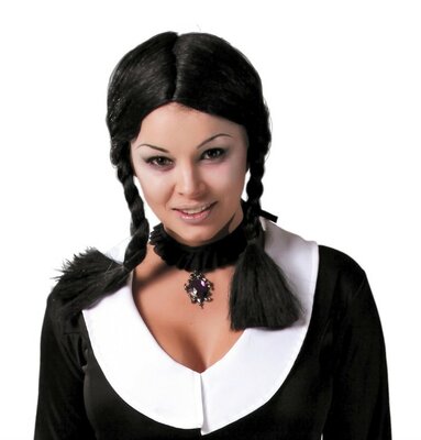 Máte radi tajomstvo, čiernu farbu a čierny humor? Potom by ste mali ísť na karneval alebo halloweensku párty v kostýme alter ega Wednesday Addams! Táto čierna parochňa s vrkočmi dokonale doplní váš outfit.