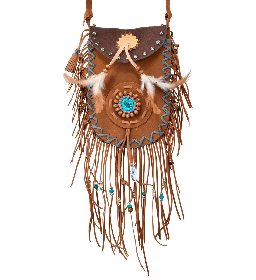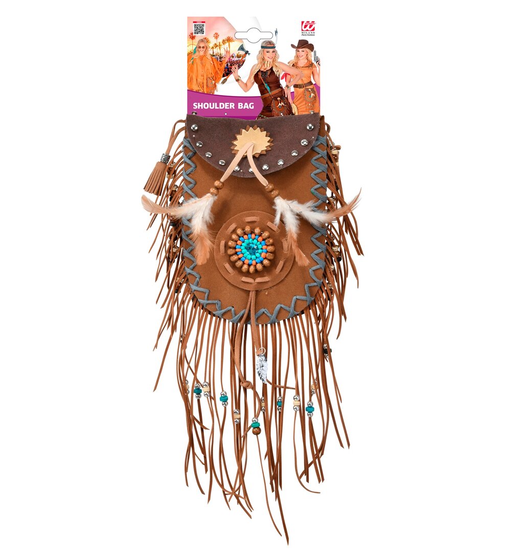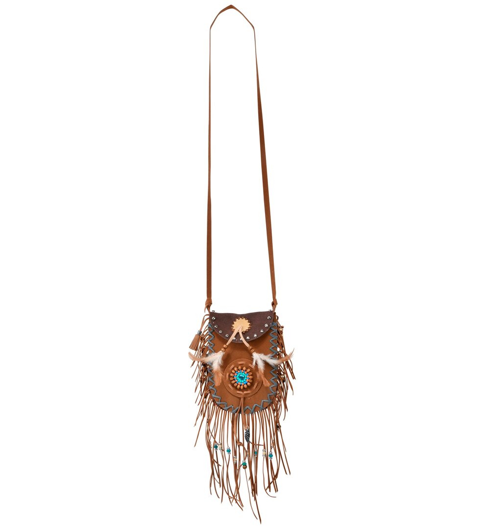 Štýlová indiánska taška zdobená korálkami a perím. Skvelý doplnok ku kostýmu indiána.