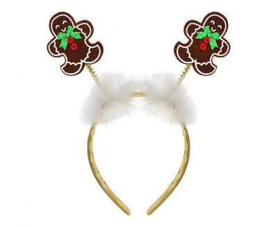 Vianočná atmosféra je vo vzduchu a vy sa chystáte von za zábavou? V tom prípade sa vám bude hodiť táto veselá vianočná čelenka. Čelenka má zlatú farbu a je doplnená perníkmi.