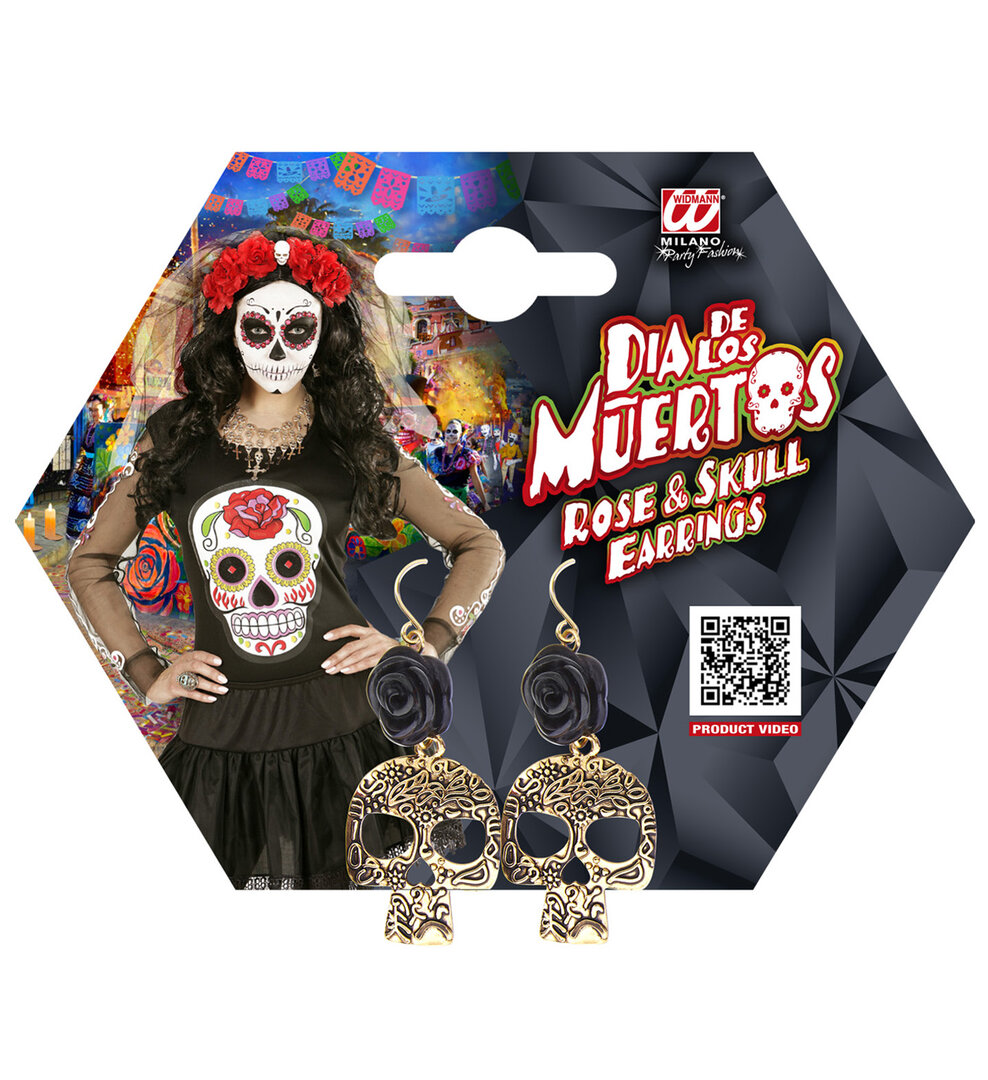 Pár náušníc s čiernou ružou a zlatou lebkou Pár náušníc s čiernou ružou a zlatou lebkou