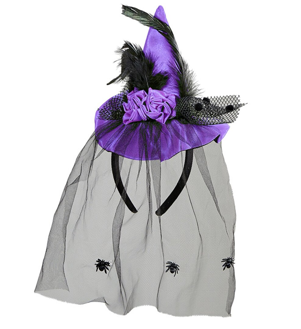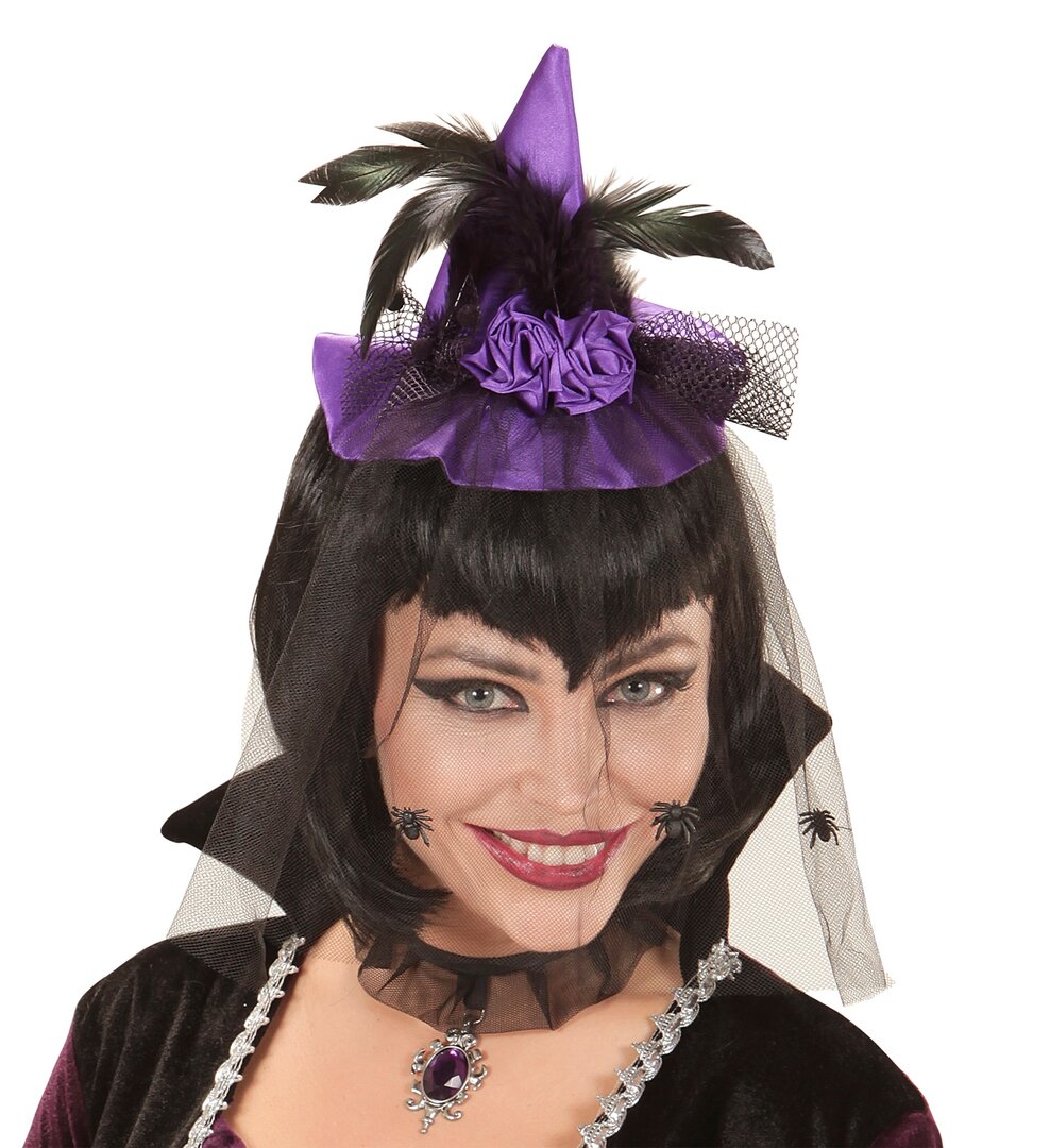 Fialový mini čarodejnícky klobúk s ružami, pierkami a tylovou pavučinou Fialový mini čarodejnícky klobúk s ružami, pierkami a tylovou pavučinou