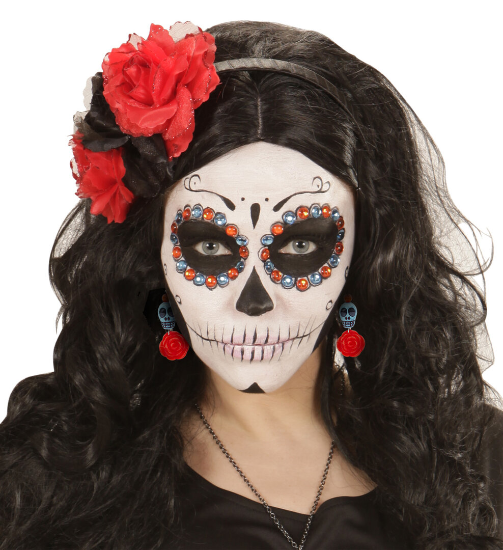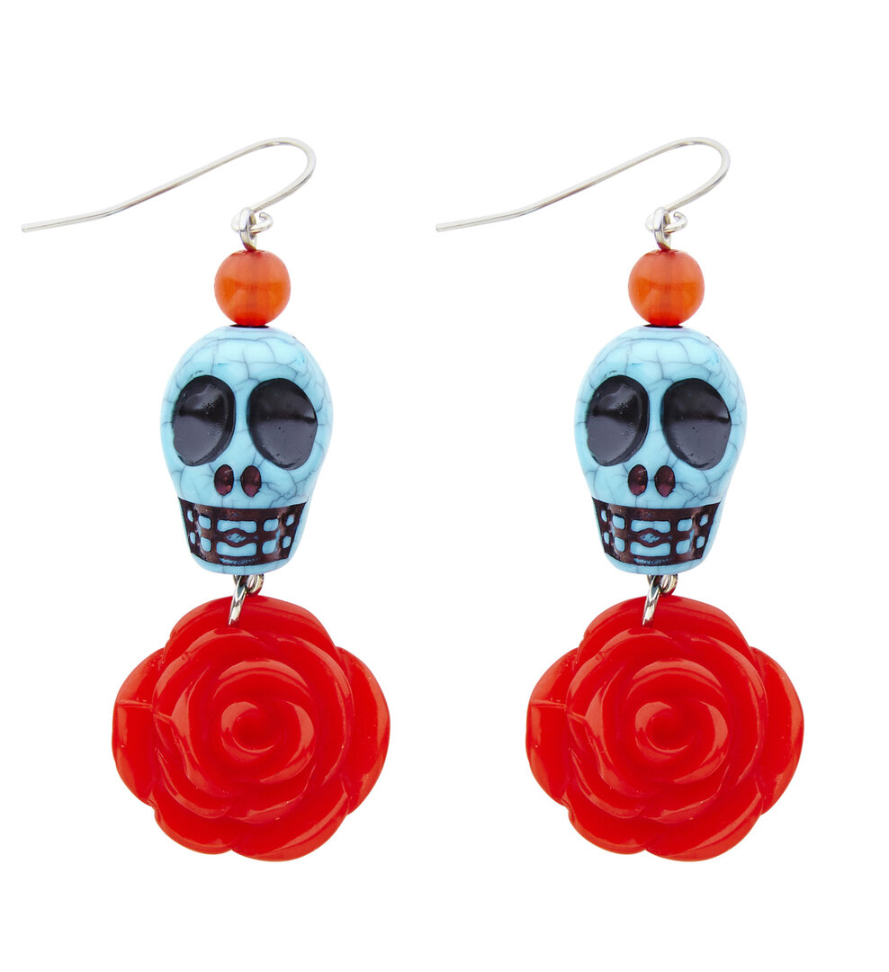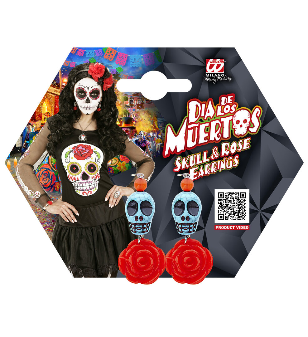 Pár náušníc s azúrovou lebkou a červenou ružou