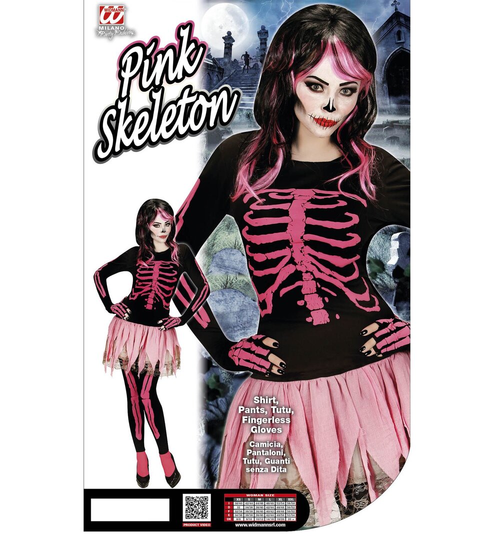 Dámsky ružový kostým kostlivca (tričko, nohavice, tutu sukňa, rukavice bez prstov) Dámsky ružový kostým kostlivca (tričko, nohavice, tutu sukňa, rukavice bez prstov)