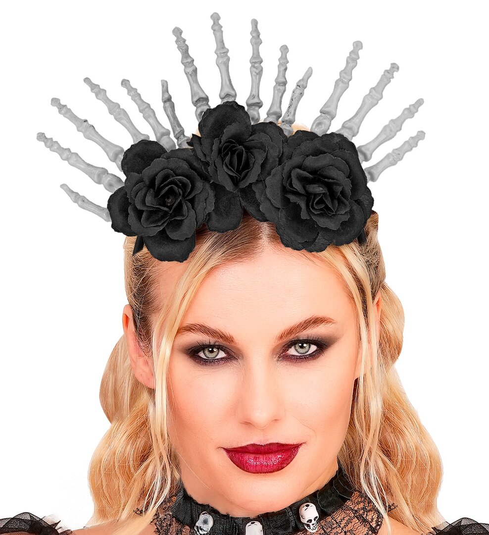 Čelenka s čiernymi ružami a rukami kostlivcov