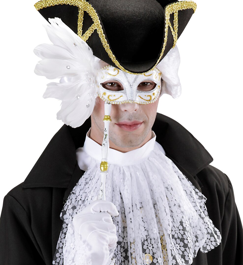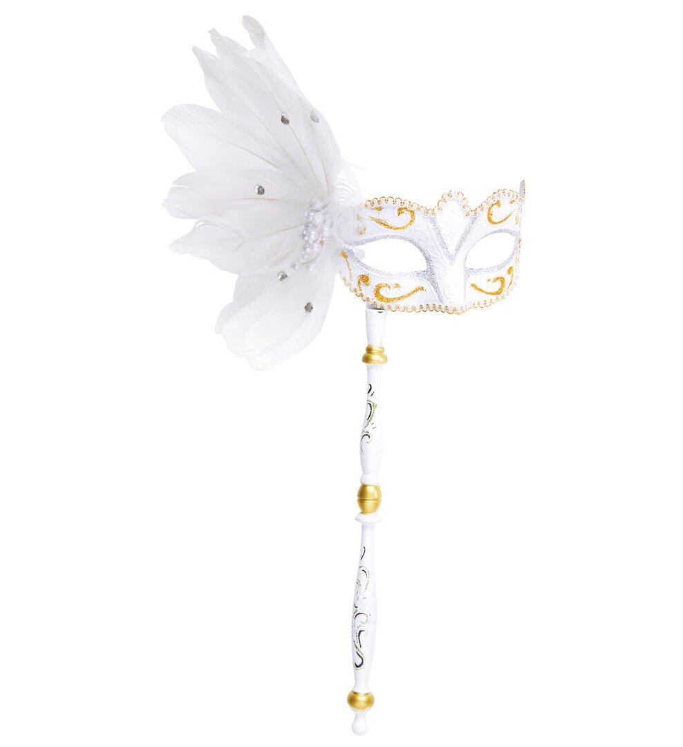 Biela škrabka na paličke s pierkami a striebornými a zlatými detailmi Biela škrabka na paličke s pierkami a striebornými a zlatými detailmi