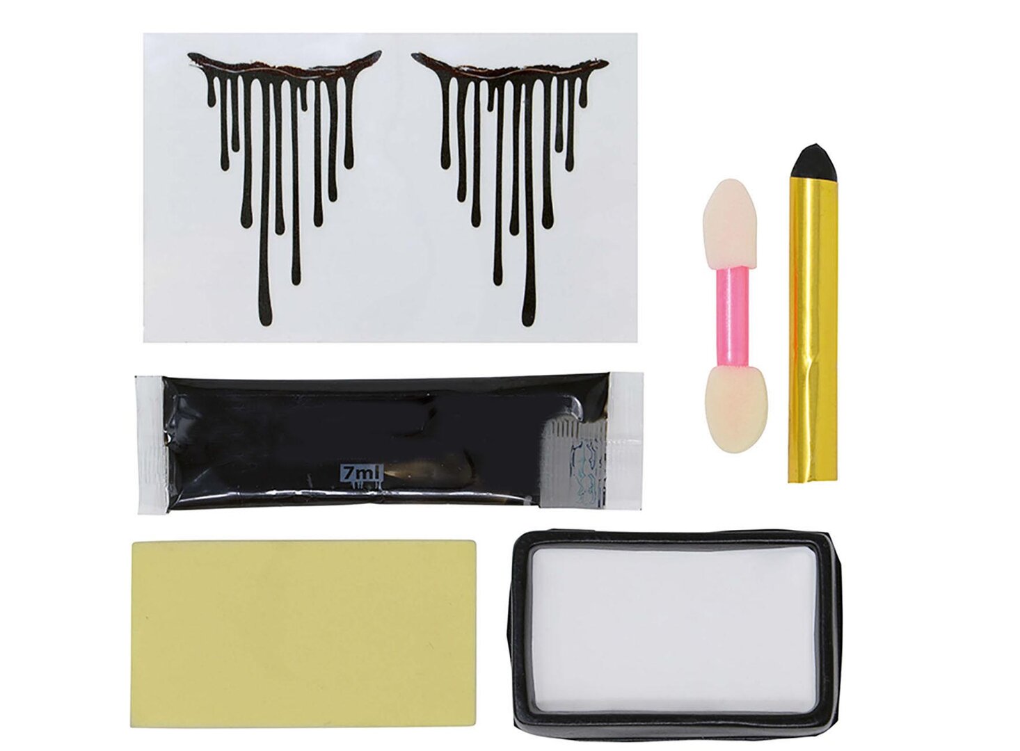 ceruzka, špongia, štetec, krv, biela farba, nálepky pod oči