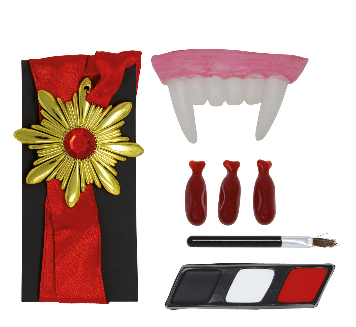 zuby, krvné kapsule, farba na tvár, štetec, medailón