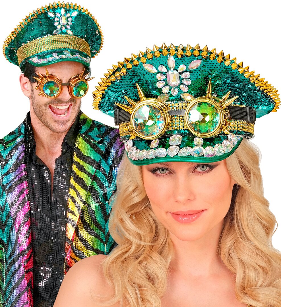 Zelený kapitánsky klobúk s okuliarmi, steampunk