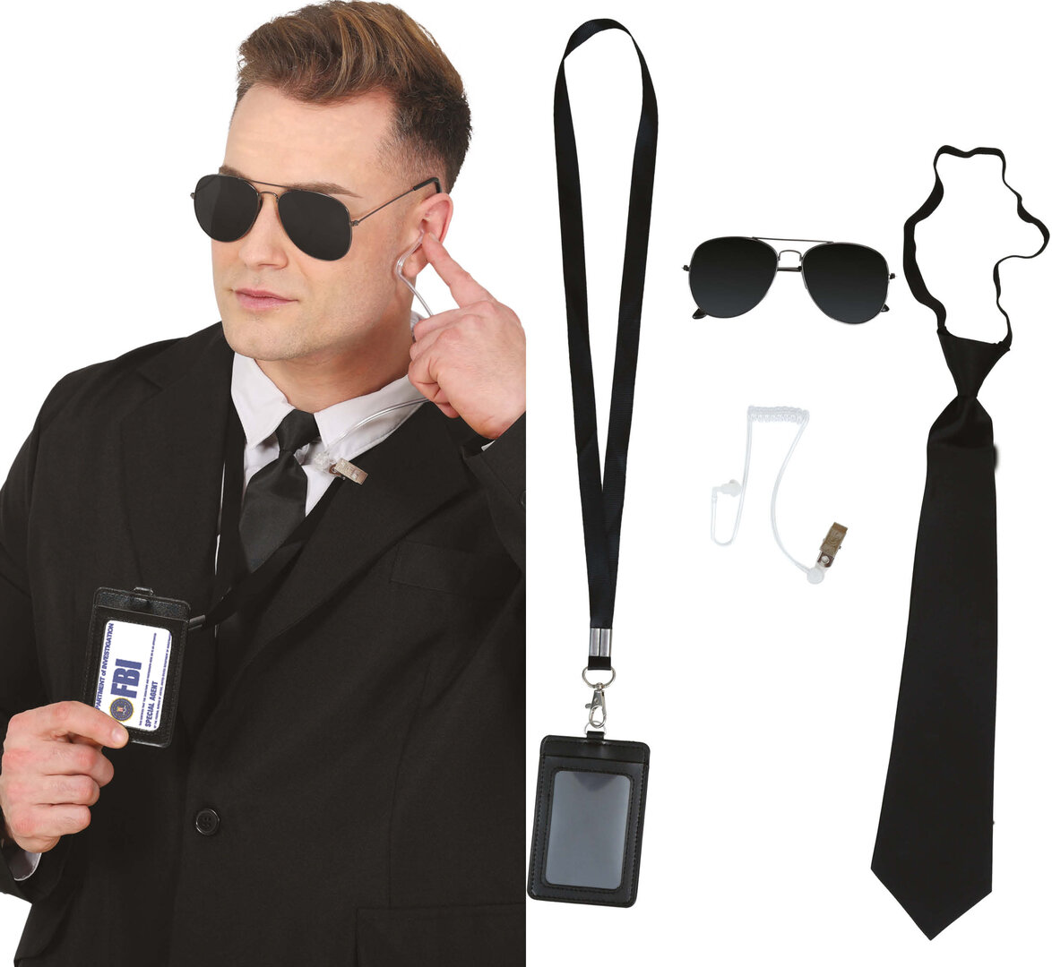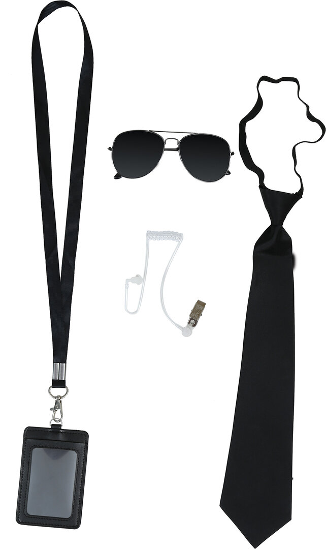kravata, okuliare, slúchadlo/mikrofón, odznak